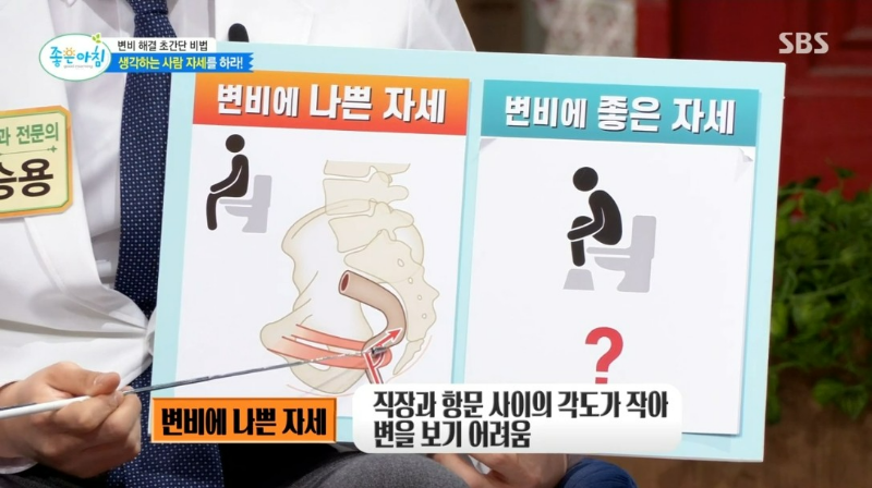 여기서 조심해야 할 것은, 허리를 과하게 굽히면 디스크 위험이 있습니다. 따라서 허리는 적당히 구부리고 다리를 많이 들어 올리는 것이 변비에 좋은 자세 입니다.