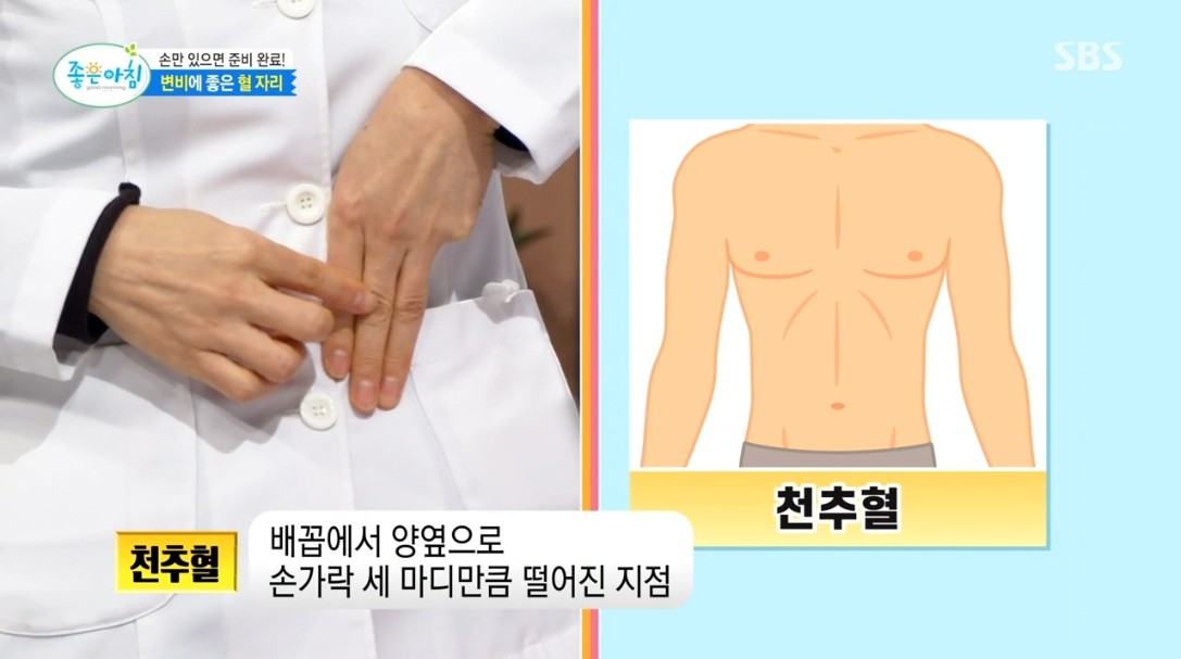 천추혈은 배꼽에서 양옆으로 손가락 세 마디만큼 떨어진 지점으로, 배 아플때 쓰다듬는 부위에 천추혈이 있습니다. 여기를 잘 지압하면 변비에 도움이 됩니다.
